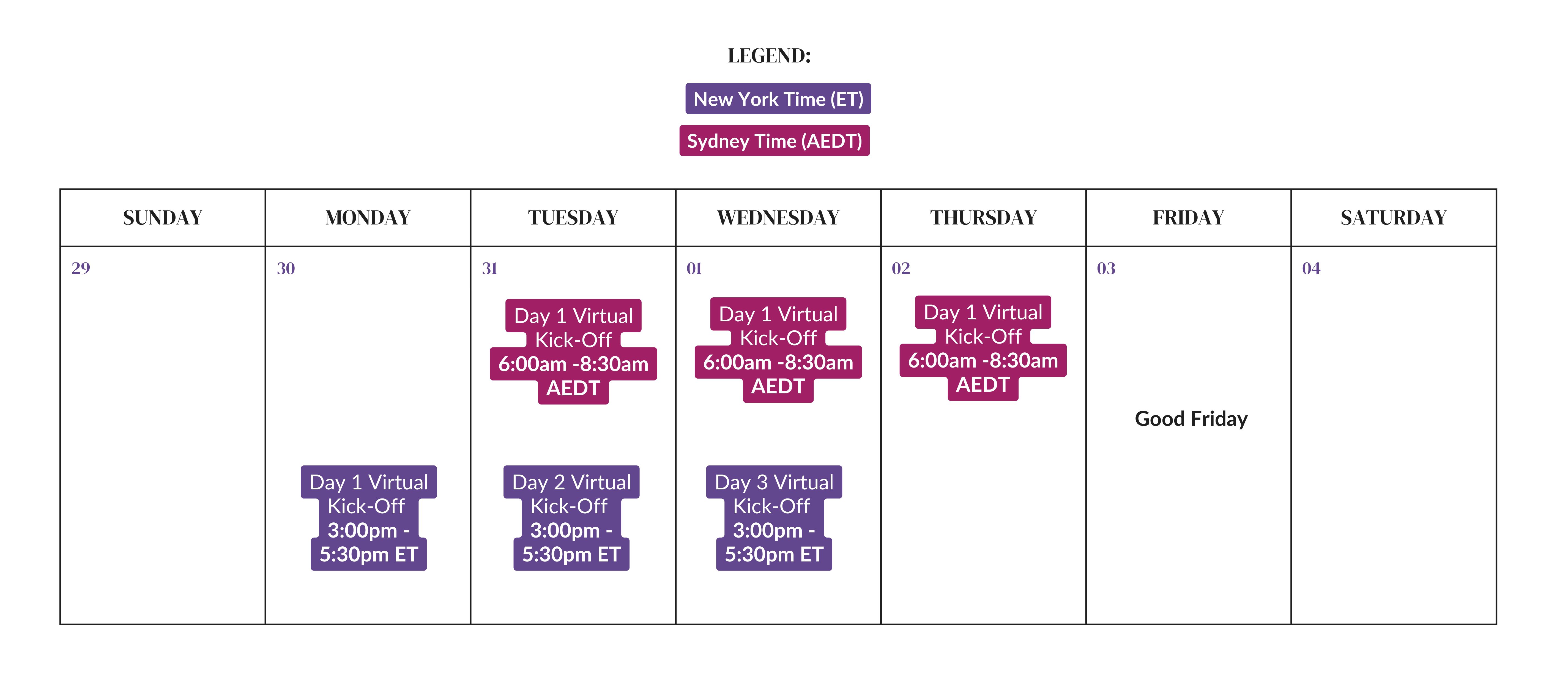 We’ll kick things off with a virtual 3-day event, running for 2.5 hours each day from 3pm–5:30pm New York time / 6am–8:30am Sydney time.